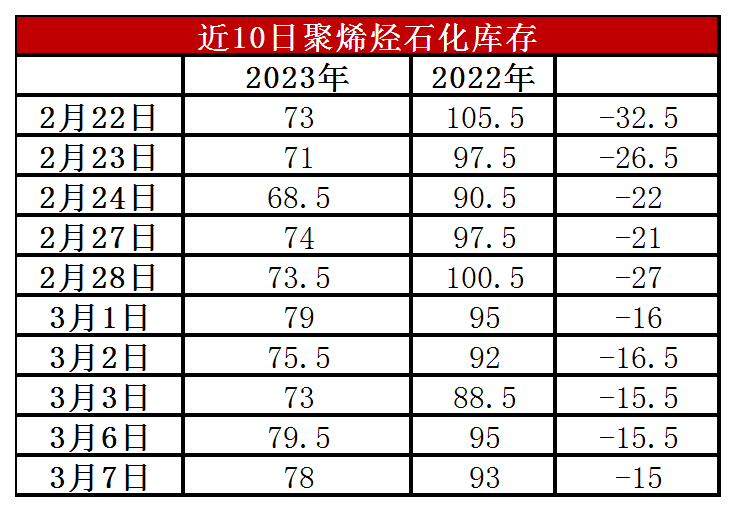 周二石化库存78万吨,较昨天下降1.5万吨(昨天修正为79.5万吨),较去年同期低15万吨左右。目前上游企业检修较多,尤其是PP开工率远低于往年同期,供应端缓解,需求端整体偏弱维持刚需,近期石化维持正常去库速度。后期来看,虽然进入集中检修期,但是新装置也陆续投产,需求端缺乏亮点,预计后期依然保存正常去库速度。