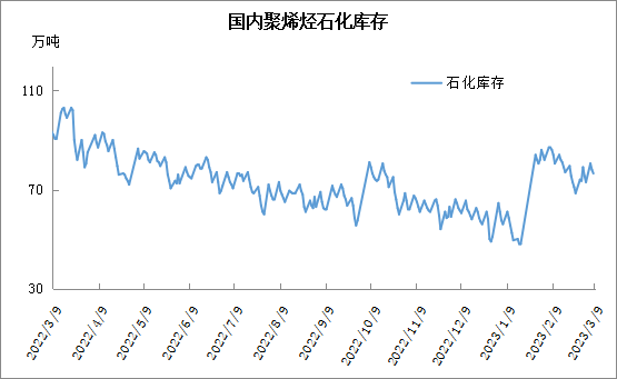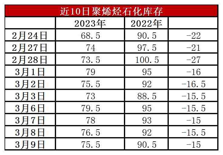 周四石化库存75.5万吨,较昨天下降1万吨,较去年同期低15万吨左右。虽然近期检修装置减少,但是前期较长时间内检修较多,尤其是PP开工率处于历史同期低位,阶段性供应端缓解;需求端整体偏弱维持刚需,近期石化维持正常去库速度,社会库存依然偏高。后期来看,虽然进入集中检修期,但是新装置也陆续投产,需求端缺乏亮点,预计后期依然保存正常去库速度。