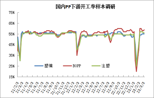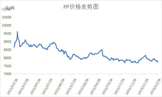 目前PP下游依然整体偏弱。虽然市场预期3月份下游需求有望改善,但是目前下游接单困难,开工率也受到一定现在,需求好转证伪。目前PP逐渐进入传统需求淡季,后期或难有实质性改善。不过PP整体偏弱背景下需要关注两点:一是价格下跌后低价成交明显好转,点价增多,现货7700附近支撑较强;二是近期房地产、基建等数据尚可,黑色下游表现好转,关注能否传导至偏终端的PP下游。