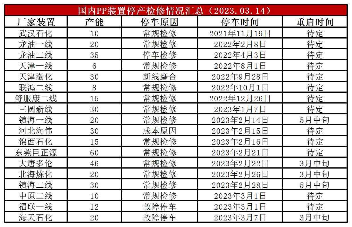 虽然宁波台塑、齐鲁石化停车检修,但是海天石化、大唐多伦等陆续重启,二者抵消后开工率变化不大,依然在90%略低一点。后期PP进入集中检修期,不过新装置也陆续投产,二者抵消后供应端或相对稳定。