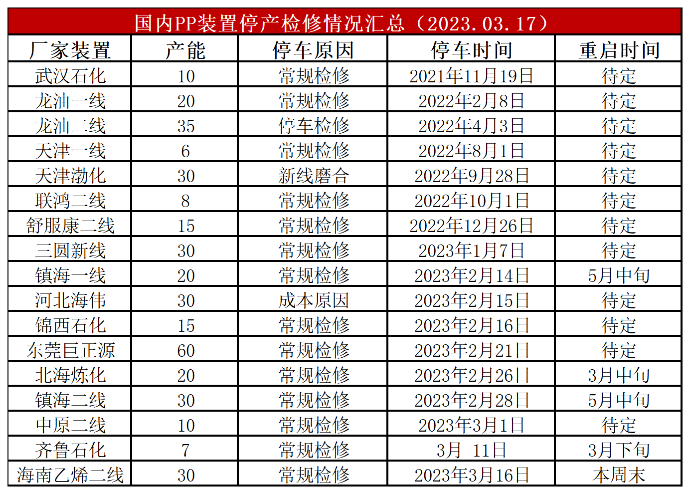 本周虽然海南乙烯停车,但是宁波台塑、大唐多伦等陆续重启,PP开工率明显反弹,目前重回90%大关,较上周提高1%,较上月同期高5%,与去年同期持平。后期PP进入集中检修期,不过新装置也陆续投产,二者抵消后供应端或相对稳定。