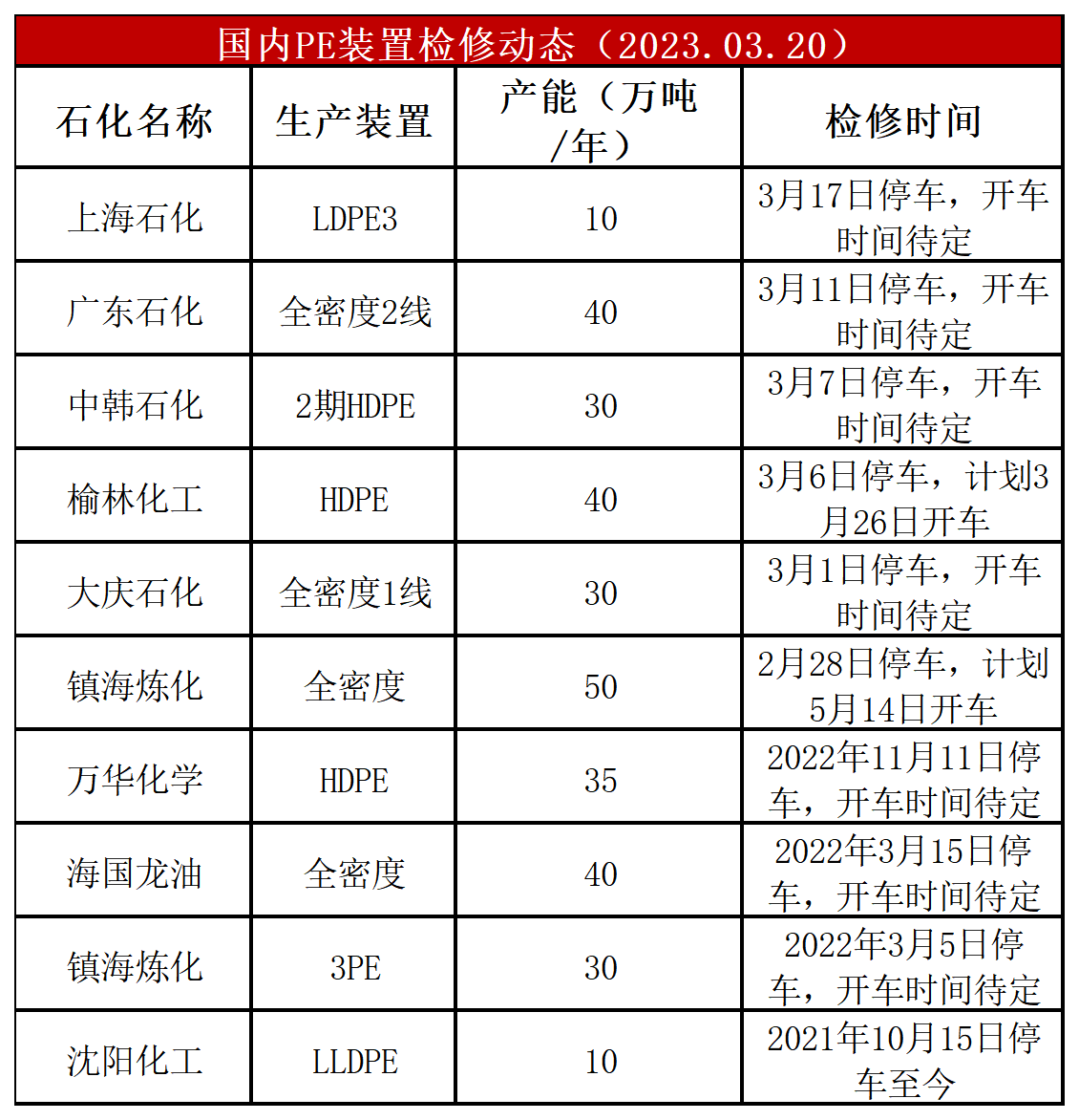 PE装置大稳小动,开工负荷维持89%左右,比上周+2%,较去年同期+4%。PE装置榆林化工HDPE、海南炼化全密度和扬子巴斯夫LDPE计划开车,预计PE开工负荷小幅上涨。