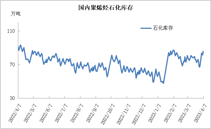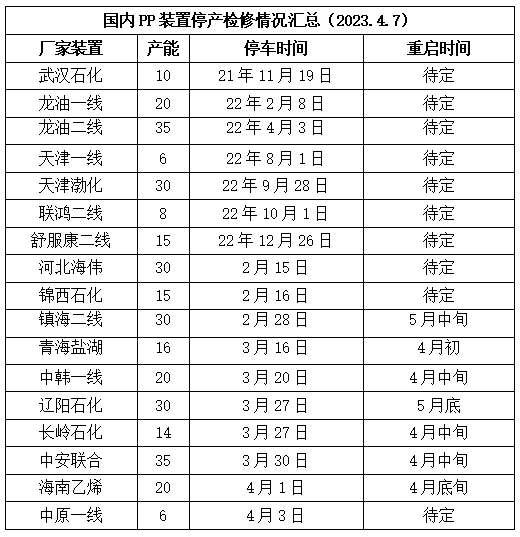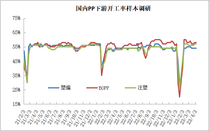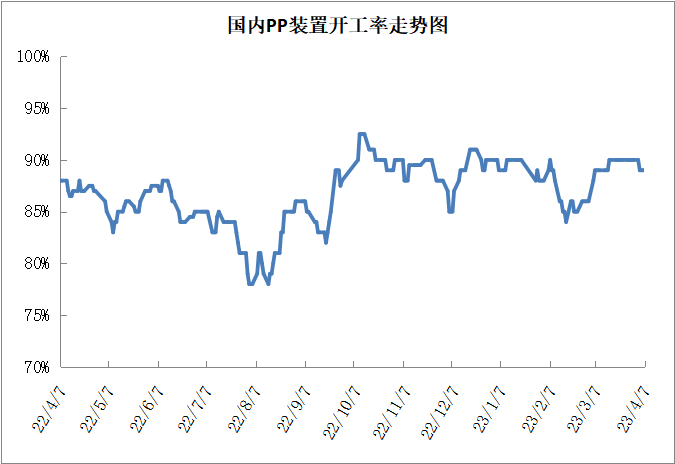 月初独山子石化等短暂停车后随即重启,PP开工率整体变化不大,继续围绕90%波动。不过4月中旬开始PP检修装置明显增多,且新装置投产暂告一段落,预计届时供应压力有望明显缓解。