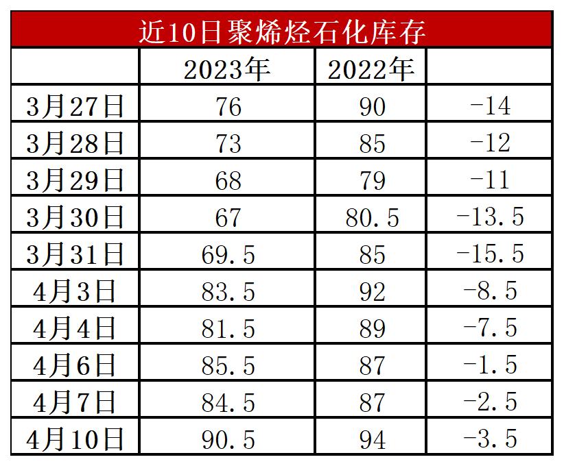 周一石化库存90.5万吨,较上周末增加6万吨,较去年同期低3.5万吨。4月份以来石化去库明显受阻,不仅出现累库迹象,甚至库存水平超过春节后,库存压力骤增。近期集中检修尚未到来,开工率偏高,需求又维持弱势,且进入传统需求淡季,供应增加需求减弱背景下,石化累库明显。不过中旬开始石化检修明显增多,预计届时库存压力有望缓解。