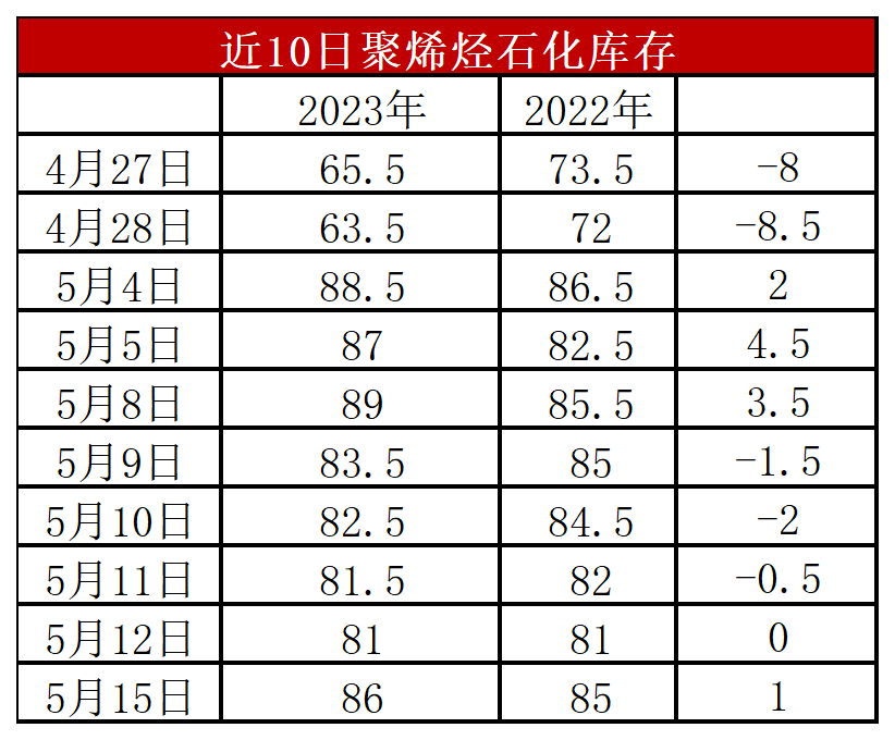 周一石化库存86万吨,较上周末增加5万吨,与去年同期基本持平。五月份以来,石化去库速度明显放缓,一度出现垒库迹象。虽然5月份检修装置依然较多,但是较四月份有所减少,而需求端难有改善甚至雪上加霜,导致供需矛盾有所显现,石化去库难度加大。