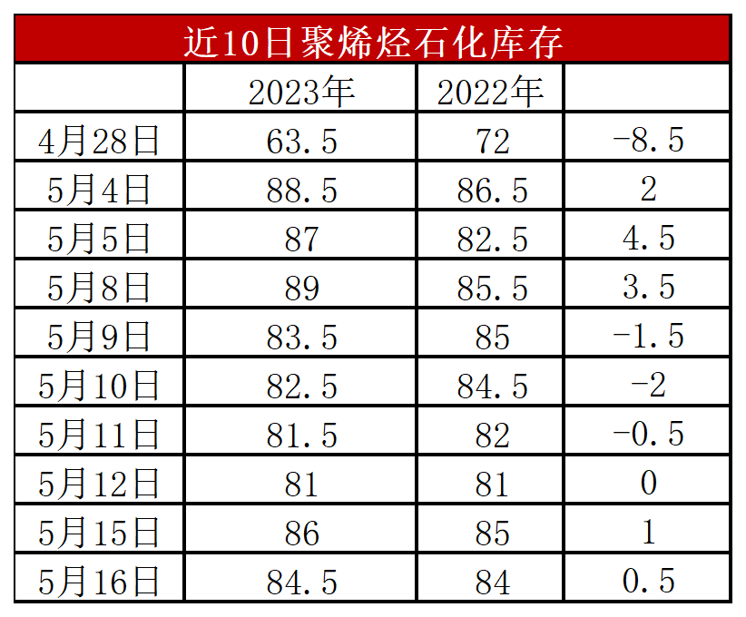 周二石化库存84.5万吨,较昨天下降0.5万吨,与去年同期基本持平。五月份以来,石化去库速度明显放缓,一度出现垒库迹象。虽然5月份检修装置依然较多,但是较四月份有所减少,而需求端难有改善甚至雪上加霜,导致供需矛盾有所显现,石化去库难度加大。