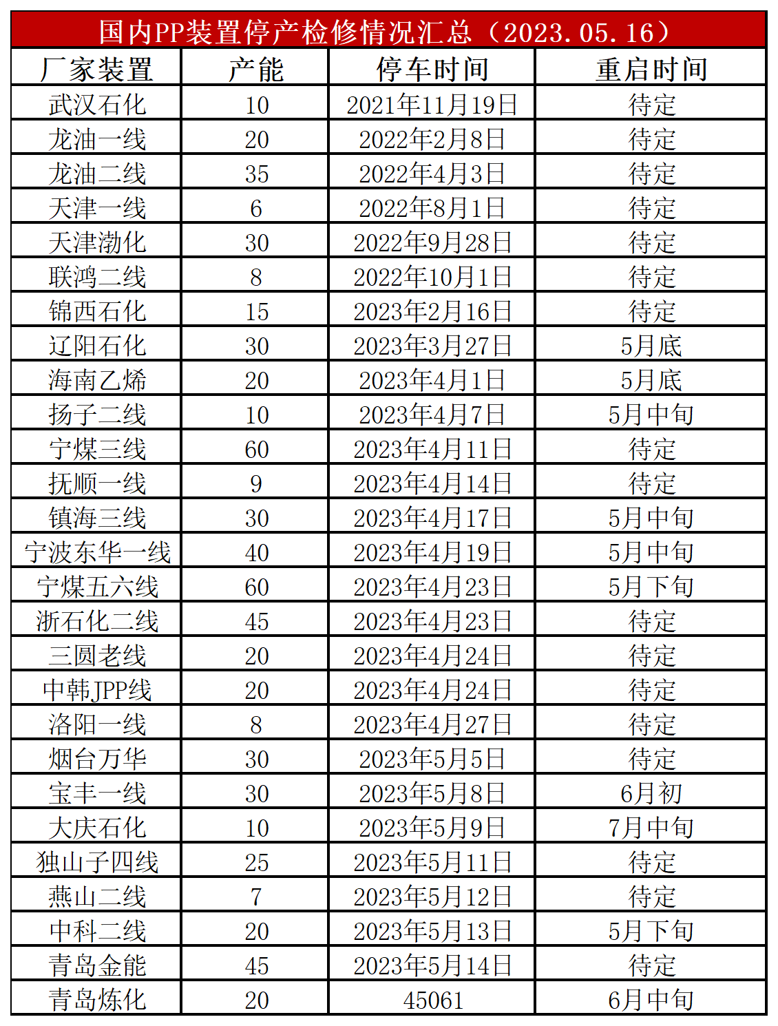 周初PP开工率变化不大,虽然青岛金能、青岛大炼油等停车检修,但是茂名石化、东莞巨正源等重启,二者抵消后PP开工率维持在83%附近。后期检修计划逐渐减少,且新装置面临投产,供应压力逐渐增大。