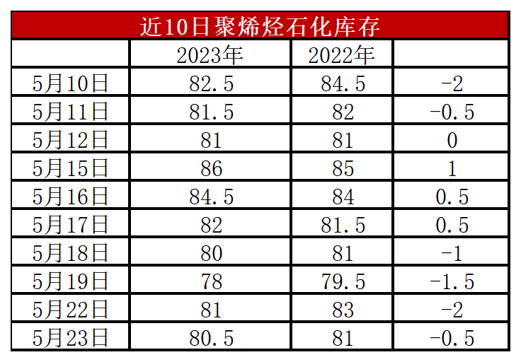 周二石化库存80.5万吨,较昨天下降0.5万吨,与去年同期基本持平。近期石化库存缓慢去库,虽然需求端整体不佳,但是石化企业检修依然较多(虽然PP检修装置有减少迹象,但是PE检修增加),供应压力暂时不大,不过低迷需求背景下,去库也难以继续提速,低库存优势基本不在,且社会库存偏高。