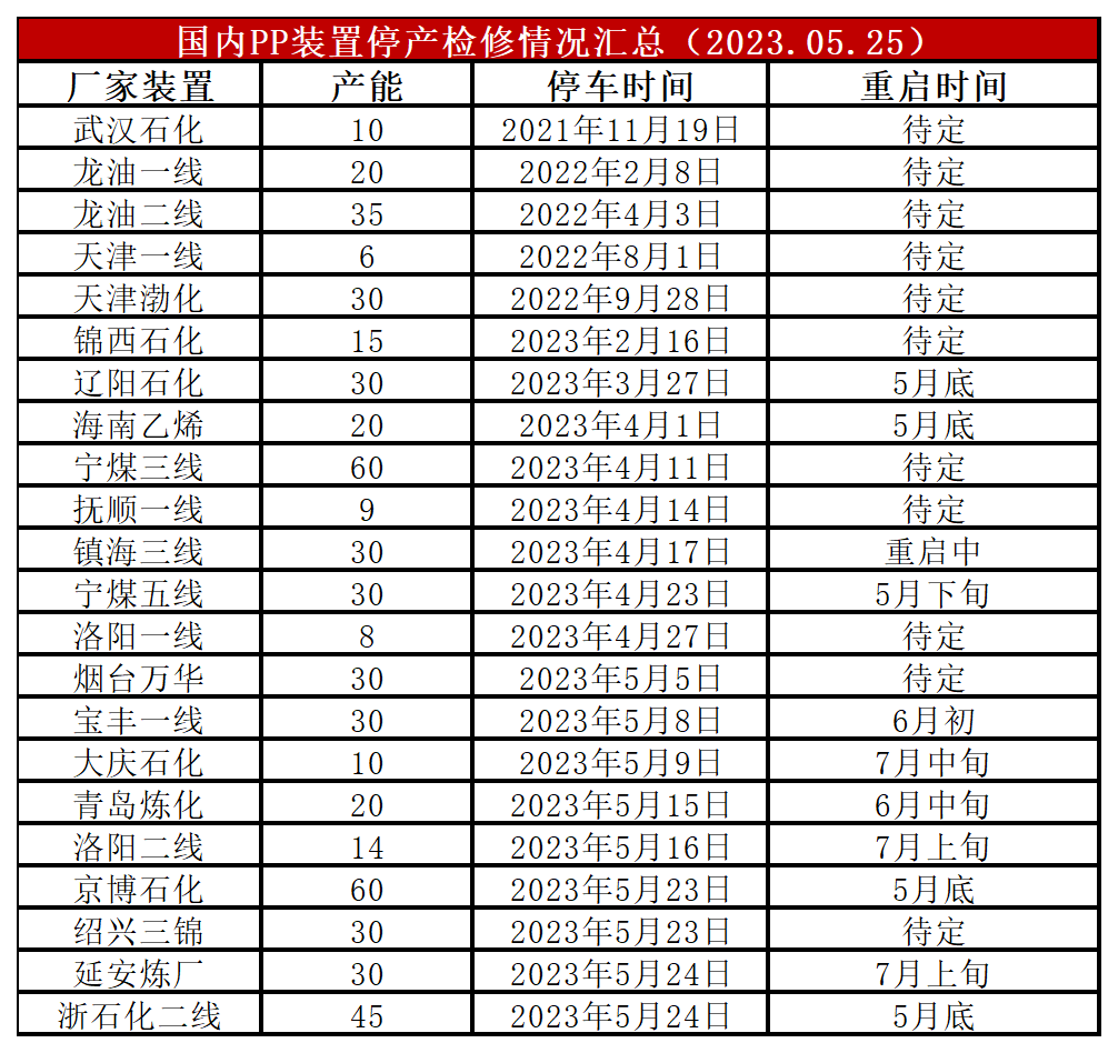 近期延安炼化、京博石化、浙江石化等部分装置停车检修,PP开工率再次降至85%附近。5月下旬及6月份仍是集中检修期,但是检修力度较4月有所下降,预计开工率维持在85%附近,且后期有3-4套新装置有投产计划,供应压力逐渐增加。