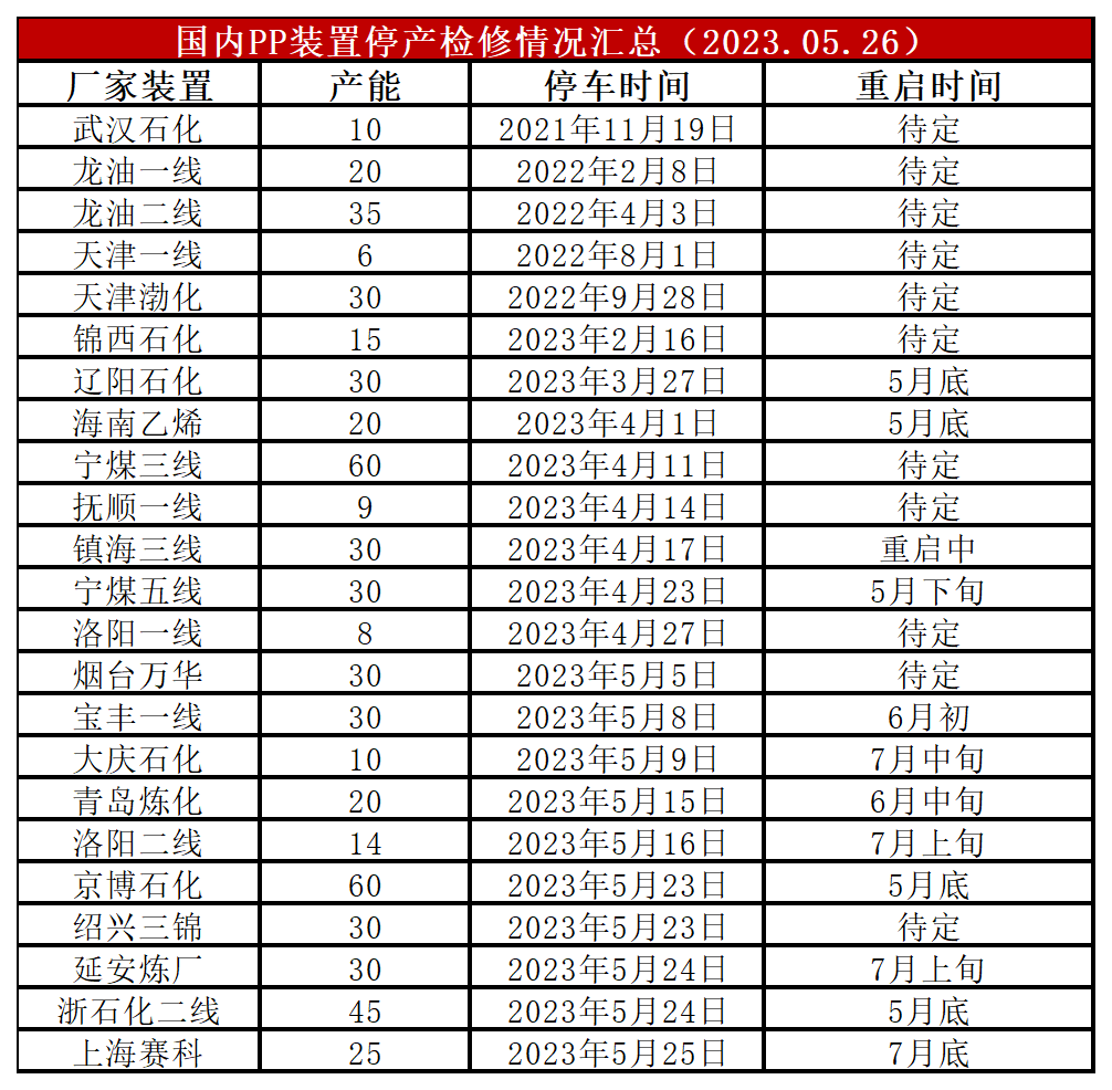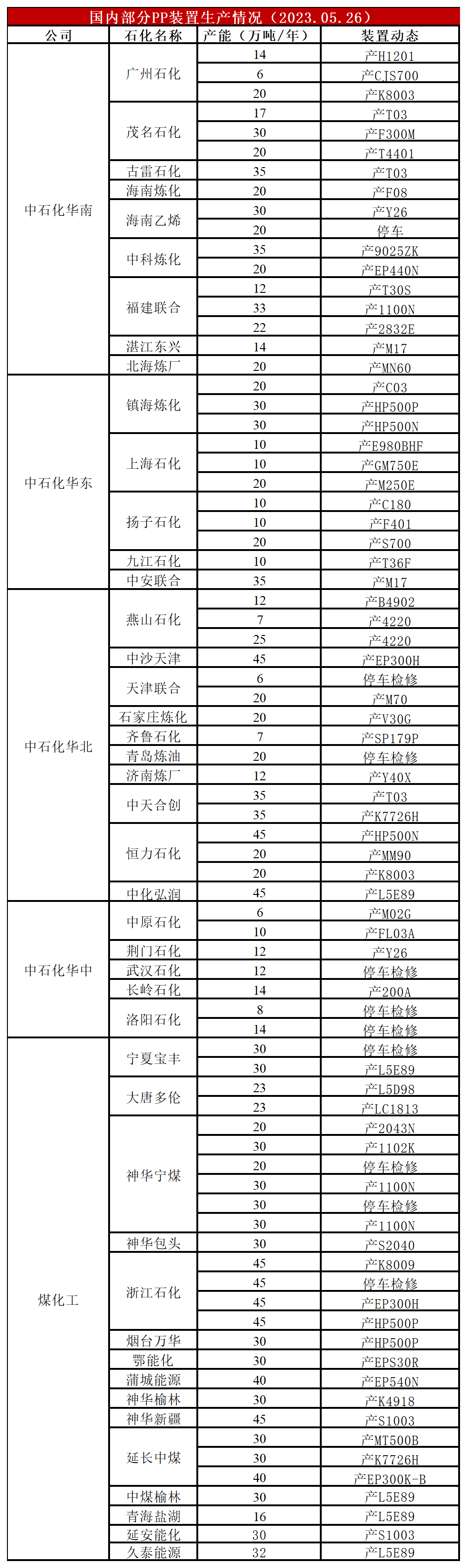 近期上海赛科、延安炼化、京博石化、浙江石化等部分装置停车检修,PP开工率再次降至84%附近。5月下旬及6月份仍是集中检修期,但是检修力度较4月有所下降,预计开工率维持在85%附近,且后期有3-4套新装置有投产计划,供应压力逐渐增加。