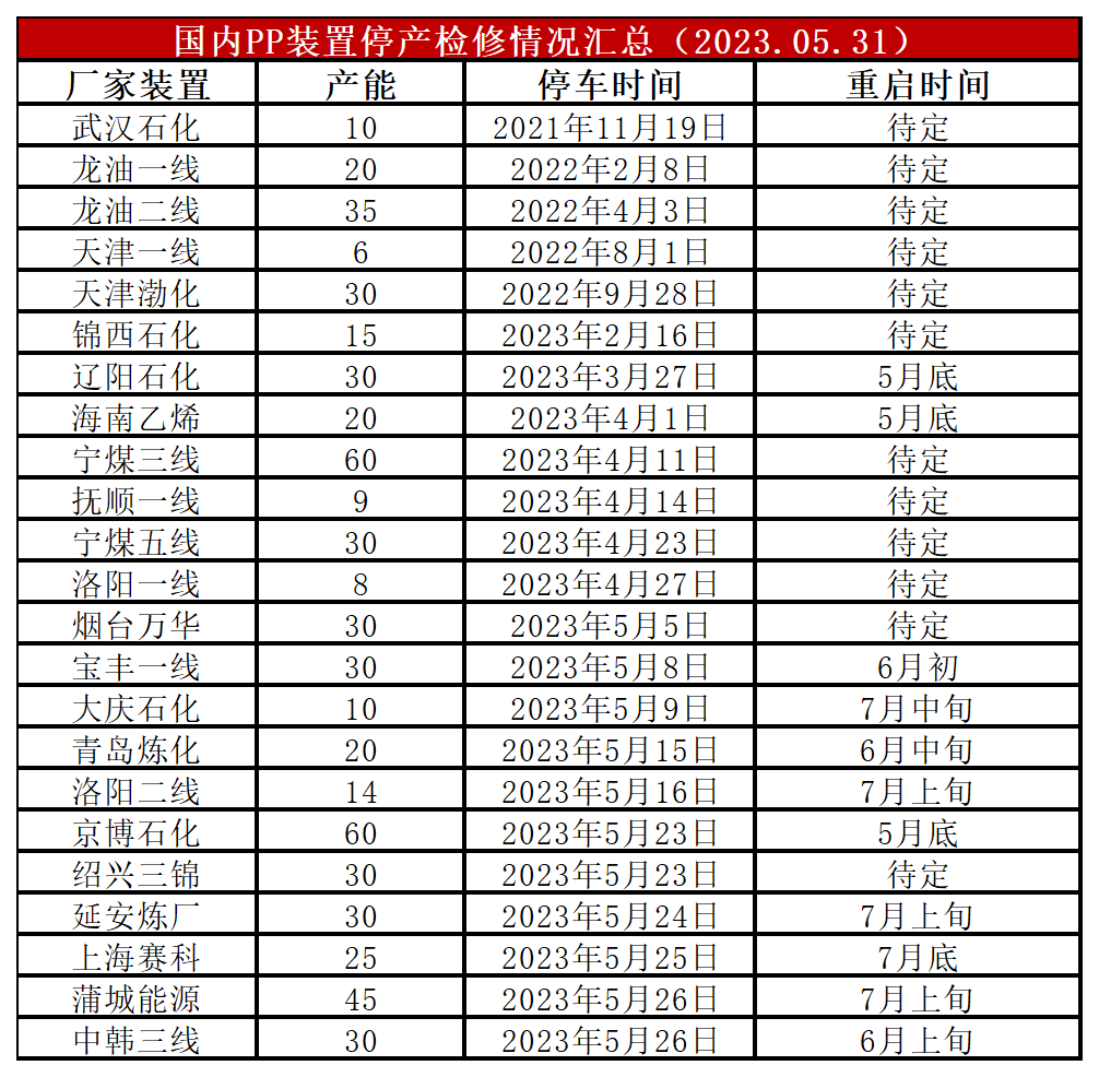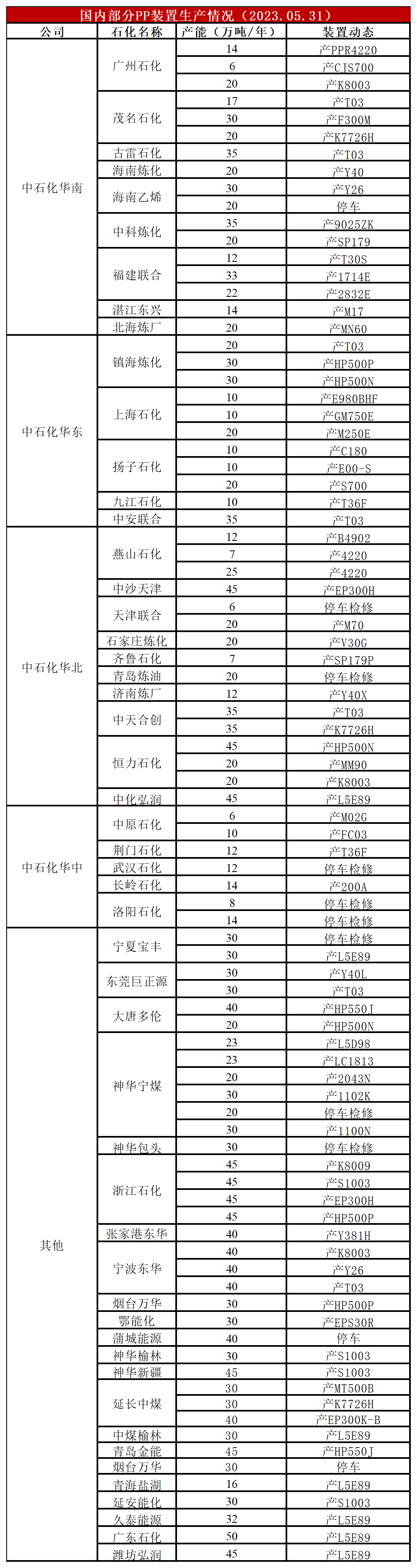 浙石化二线重启,PP开工率小幅反弹至84%附近。5-6月份仍是集中检修期,但是检修力度较4月有所下降,预计开工率维持在85%附近,且后期有3-4套新装置有投产计划,供应压力逐渐增加。