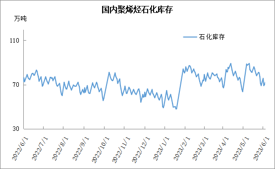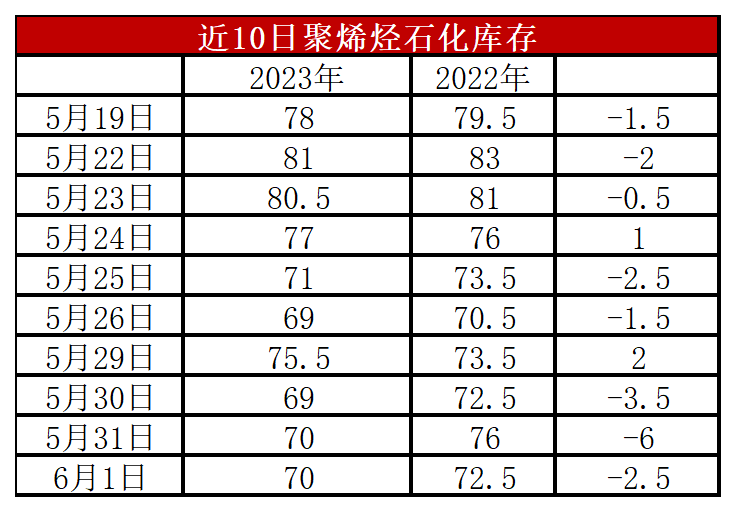 周四石化库存72万吨,较昨天增加2万吨,较去年同期低2.5万吨。5月下旬以来,石化快速去库,一度跌破70万吨大关,主要得益于月底石化面临结算,贸易商拿货增多,并且下旬低价货源出现后抄底及补库增多,加速石化去库。月底石化停销结算,库存暂时垒库,月初或消化社会库存,继续去库有一定难度。