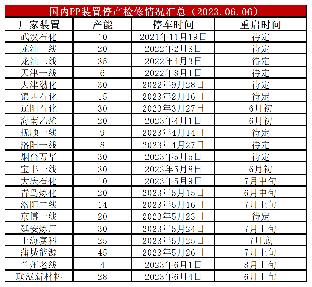 虽然联泓新材料停车检修,但是京博石化、绍兴三圆、中韩石化等前期检修装置重启,PP开工率继续走高至88%附近。6月份仍是集中检修期,但是检修力度较4-5月有所下降,预计开工率小幅走高,且后期有3-4套新装置有投产计划,供应压力逐渐增加。