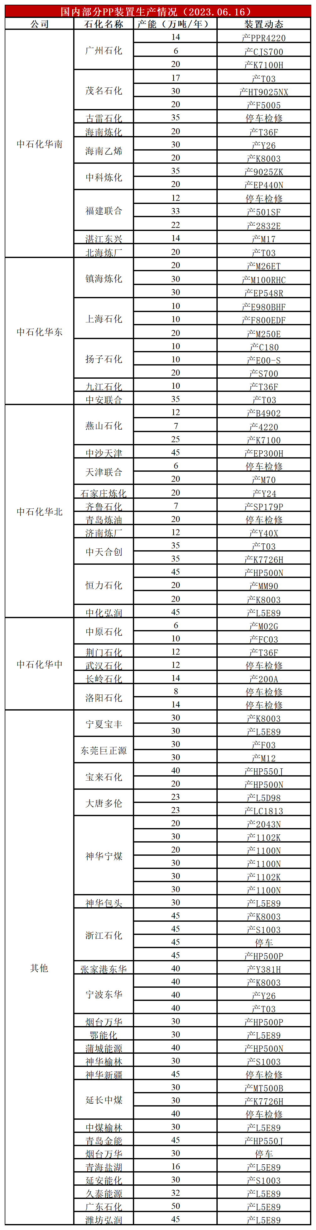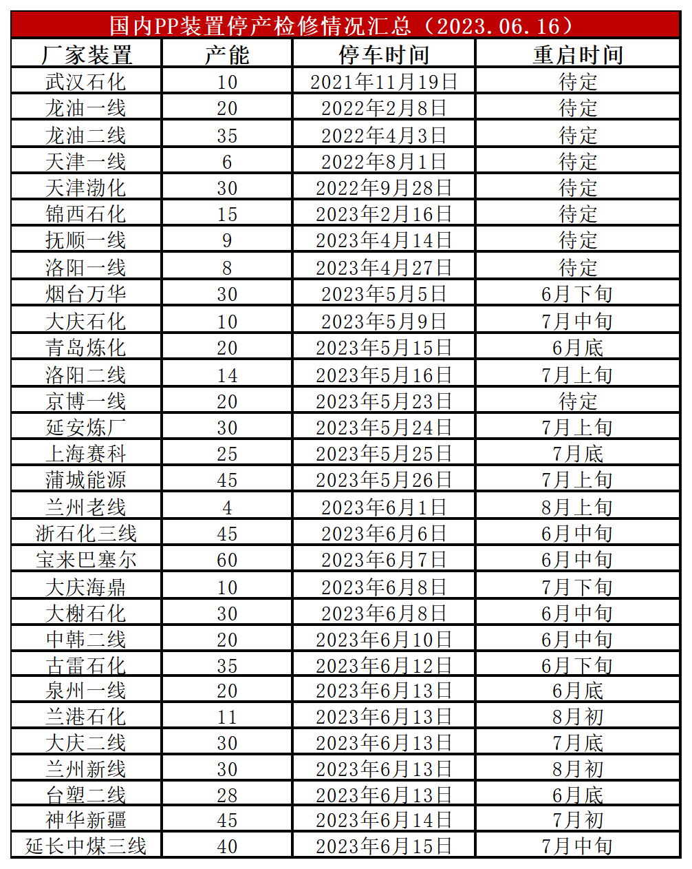 本周PP检修装置明显增多,延长中煤、神华新疆、中化泉州、大庆炼化等装置停车检修,PP开工率降至82%附近,为阶段性低点。不过6月中下旬重启装置较多,预期开工率难以继续下降。8月份之前有3-4套新装置有投产计划,供应压力逐渐增加。