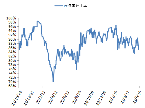 本周PE装置按计划停车较多,开工负荷略下降,周末在87%左右,比上周-3%,较去年同期+3%。PE装置独山子时候全密度计划停车,预计PE开工负荷变化不大。