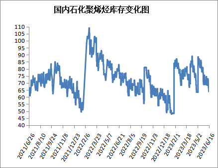 截至6月16日石化聚烯烃库存在64万吨,较上周下降4.5万吨。主因停车装置较多,开工负荷降至85%左右的较低位置,供应减少;其次因为宏观利好带动市场心态,投机交易增加,资源向下传导,所以石化库存去库加快。下周石化装置预计变化不大,下游需求维持刚需且难有改善,供需边际好转时间预计在7月中旬,石化预计维持挺价惜售,所以预计石化库存降幅有限。