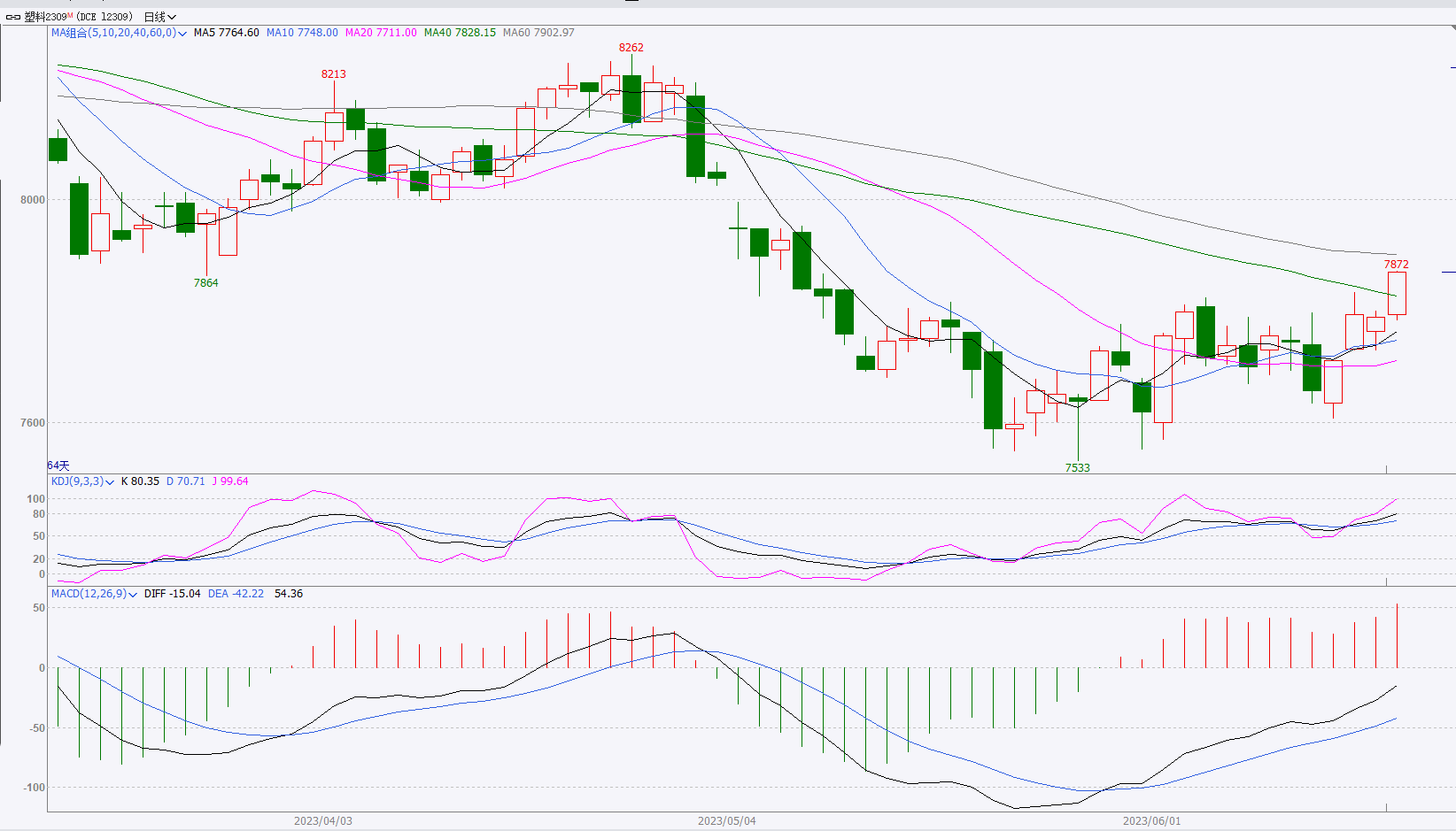 本周塑料主力上涨为主,MACD红柱延长,KDJ指标形成金叉后继续向上发散,均线转为多头排列,持仓变化不大。国内外宏观转为宽松,业者心态转好,且消息面仍有利好预期,KDJ和MACD指标提示L09仍有涨幅,突破40日均线,上方压力点在60日均线,压力点位7900,5日10日20日均线均呈涨势,预计L09稳中有涨,仅供参考。