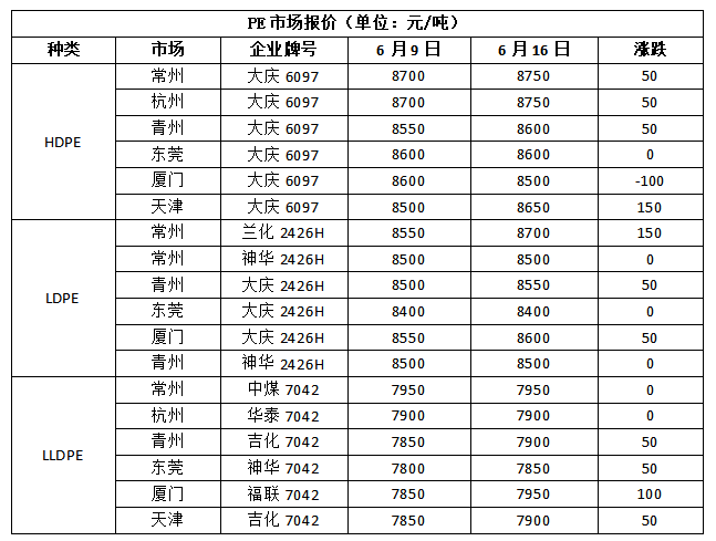本周聚乙烯市场走势偏强,一方面检修装置不断落地,供应压力有所缓解;一方面因为国内外宏观环境宽松形成共振,塑料主力上涨,市场心态好转,投机交易增加,市场价格重心上移,基差走弱,下游开工负荷难以提振抑制了涨幅。华北市场LLDPE主流7820-7900,LDPE主流8500-8550,HDPE主流7850-8650;华东市场LLDPE主流7900-8000,LDPE主流8300-8450,HDPE主流8050-9450;华南市场LLDPE主流7900-7950,LDPE主流8300-8400,HDPE主流9350-9900。