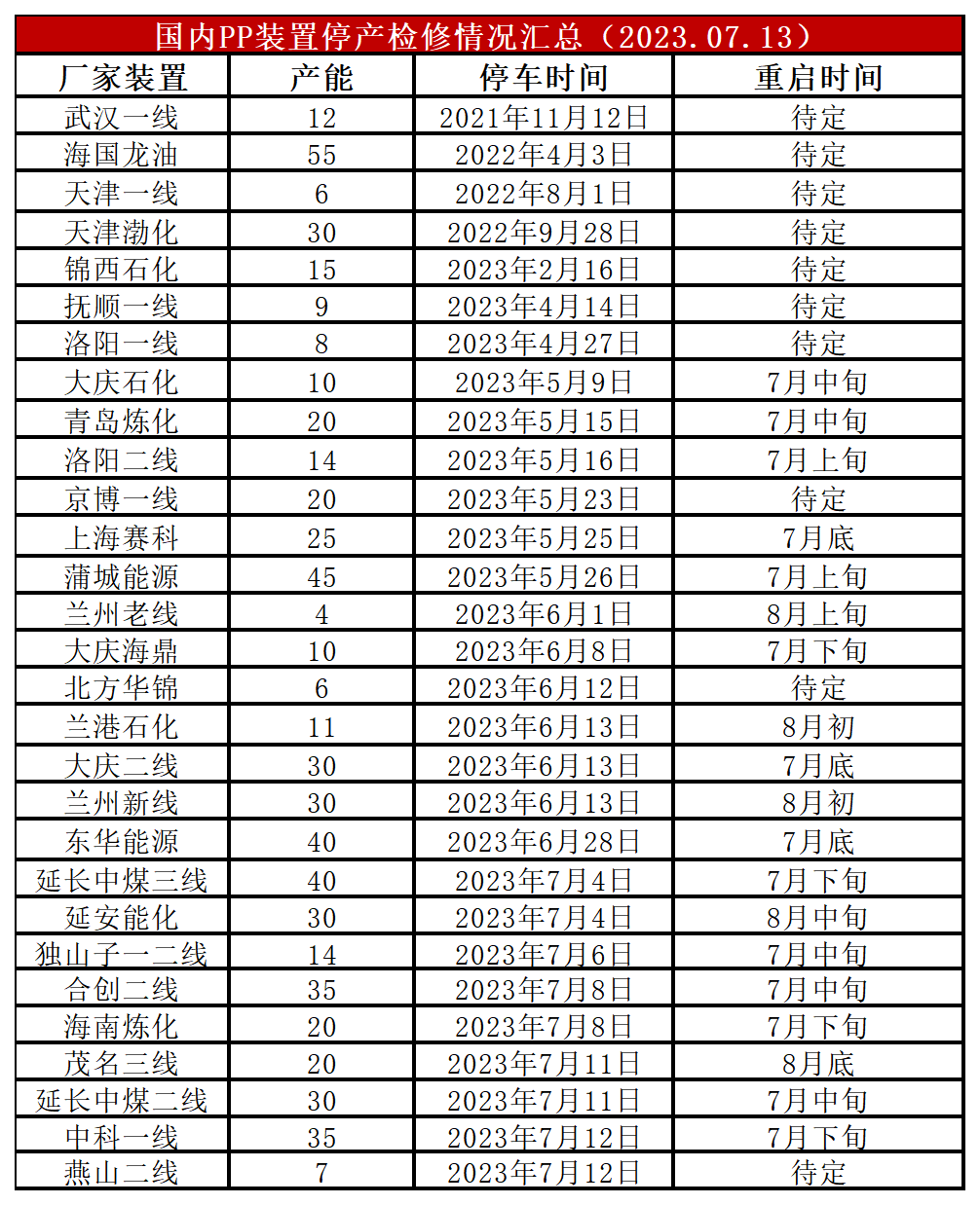 燕山石化、中科炼化等装置停车,PP开工率继续下降,目前降至84%附近,但是后期重启装置增多,开工率难以维持低位水平。整体来讲PP集中检修期已经结束,且8月份之前有3-4套新装置有投产计划,供应压力逐渐增加。