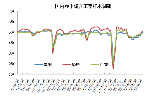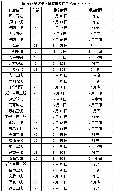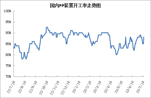 本周PP开工率整体回落。本周宝来石化、青岛金能、中科炼化等多套装置停车检修,PP开工率一度降至85%以下,但是京博石化、徐州海天等装置重启,PP开工率反弹至86%附近,且7月中下旬多套装置重启,结束开工率仍有反弹空间。