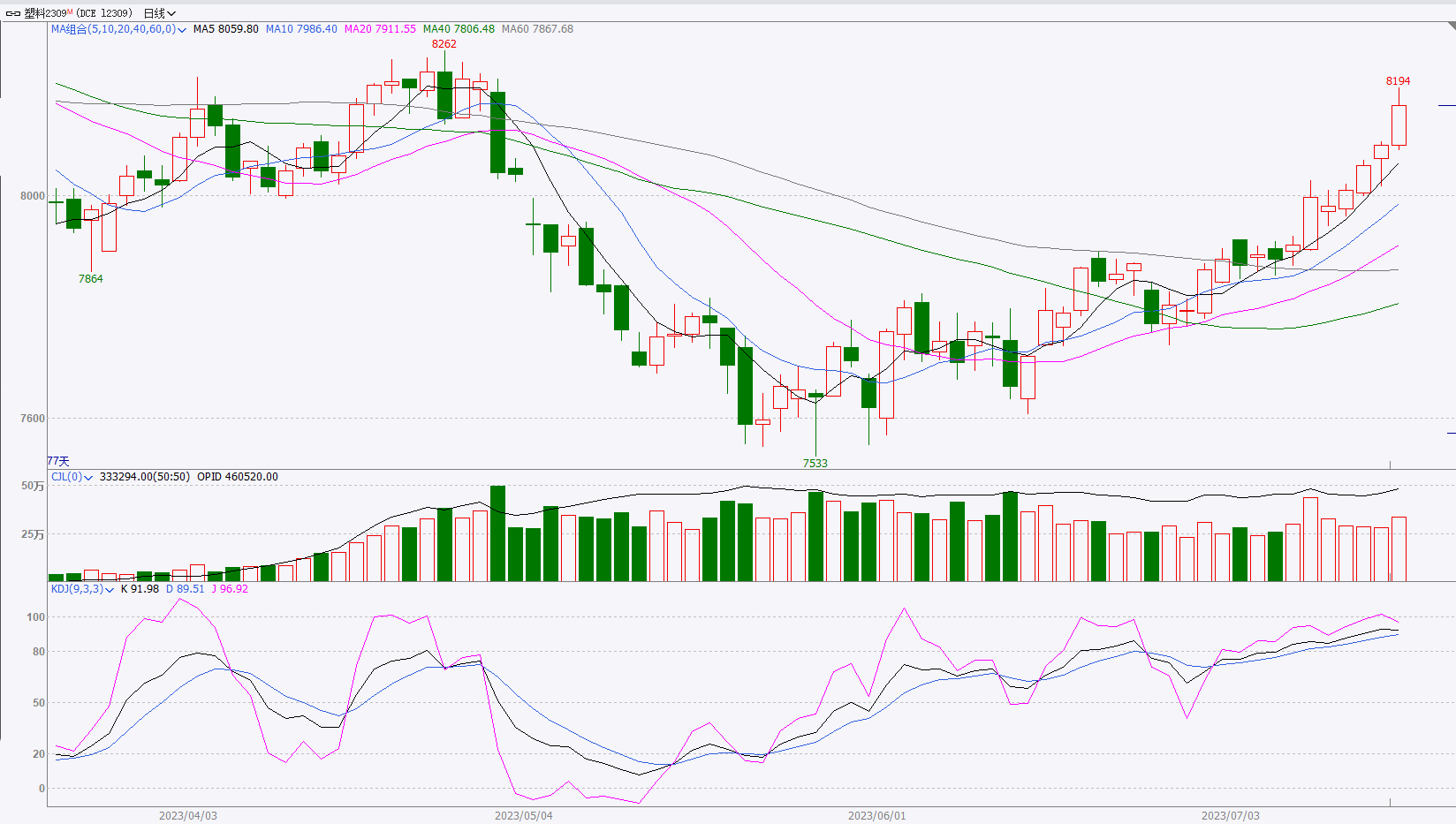 下周聚乙烯市场会再进入再均衡阶段,强宏观面和弱基本面继续碰撞。市场价格连续上涨,打压下游采购积极性,主因下游需求有好转预期,但是迟迟难以落地;供应预计小幅增加,计划开车装置较多,除线性外进口套利窗口打开,宁夏宝丰三期HDPE初步计划7月底投产。市场对七月底经济会议预期较强,心态偏多,再加上国际原油期货上涨为主,成本支撑持续增强,宏观面偏多;技术面来看,K线上方压力较大,有回调压力。而下游的真正需求,才是市场能否顺利上涨的关键,预计下周聚乙烯市场宽幅调整,再均衡寻找方向,仅供参考。