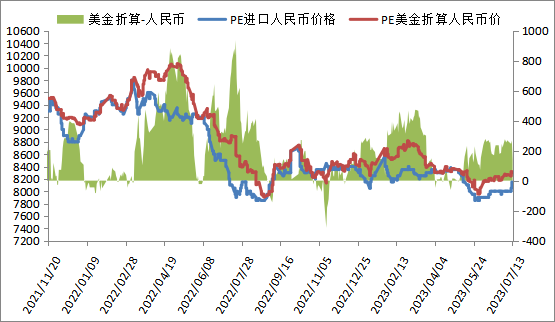 本周PE进口线性美金主流价格上涨,周末在940-960,折算人民币成本在8300-8450,市场主流8100-8200,高国产线性200-250左右,价差缩小。