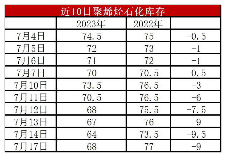 周一石化库存68万吨,较上周末增加4万吨,较去年同期低9万吨。7月初石化一度去库受阻甚至累库,目前恢复正常去库状态。上周石化计划外检修增多,且市场情绪明显好转,投机性需求增加,成交好转,促使去库提速,但是在刚需改善有限且后期供应增加,连续反弹后市场面临回落,预计本周去库速度略有放缓。