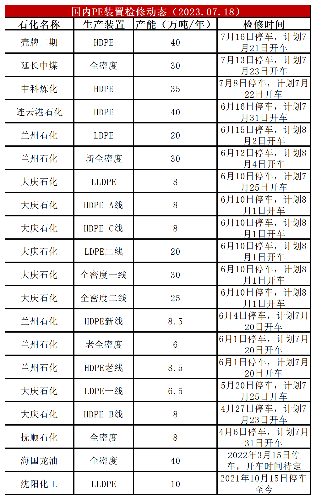 PE装置上海赛科全密度、延长中煤HDPE、吉林石化HDPE、独山子新全密度开车,壳牌二期HDPE、延长中煤全密度停车,开工负荷上涨至85%左右,比上周+2%,较去年同期+0%。PE装置兰州石化三条线、中天合创LDPE计划开车,中天合创LDPE、齐鲁石化HDPE、燕山石化HDPE计划停车,预计PE开工负荷小幅调整。