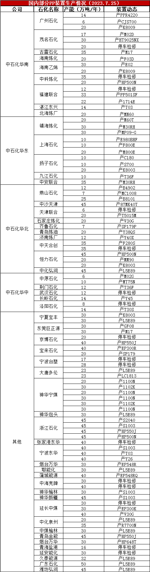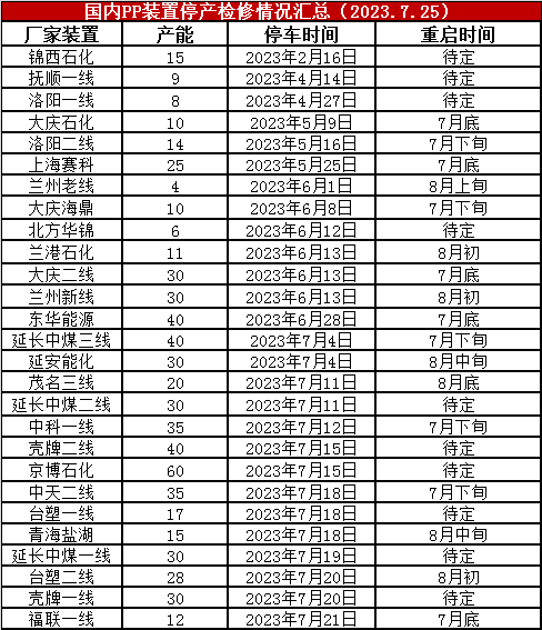 简评:海南炼化、青岛金能、燕山二线等装置陆续重启,PP开工率反弹至83%附近,较上周末提高3%,较上月同期低3%,较去年同期低1%。不过7月中下旬重启装置较多,预计PP低开工率难以维系,且9月份之前有3-4套新装置有投产计划,供应压力逐渐增加。