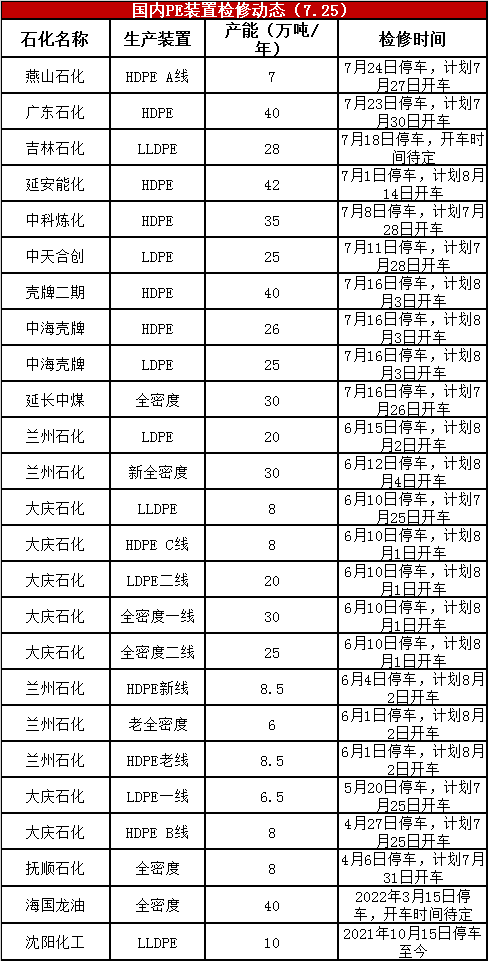 简评:PE装置大庆石化HDPE开车,燕山石化 、广东石化HDPE停车,开工负荷下降至82%左右,比上周-3%,较去年同期+2%。PE装置大庆石化全厂、中科炼化HDPE、中天合创LDPE、延长中煤全密度燕山石化HDPE、广东石化HDPE计划开车,中煤榆林全全密度计划停车,预计PE开工负荷小幅上涨。