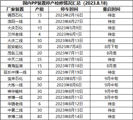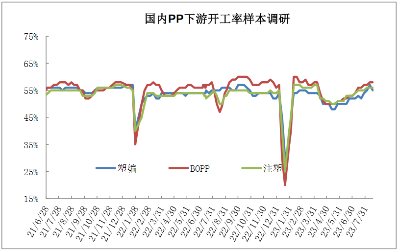 进入8月份之后,石化去库明显受阻,甚至一度出现垒库迹象,本周去库3.5万吨,连续两周去库不足5万吨,远低于正常水平。近期石化企业开工率整体提高,且新装置再次投产,供应压力增加,需求改善有限,尤其是塑编等出现负反馈,导致去库速度明显放缓。
