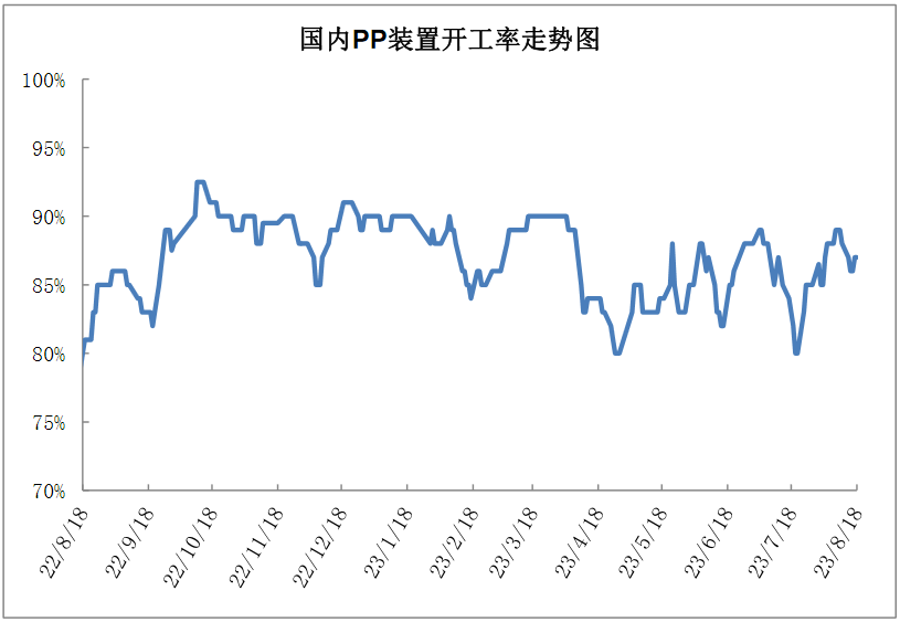 本周PP开工率变化不大,虽然部分计划外装置检修增多,但是力度有限,PP开工率整体小幅下降,目前仍在87%附近。后期PP检修计划较少,预计开工率有望维持高位,但是需要关注PDH装置,是否因为亏损而出现停工。除了PP开工率整体走高之外,新装置方面,京博石化、中石化安庆已经正式投产,近期茂名东华、青岛金发等也面临试车,供应端压力较大。