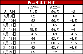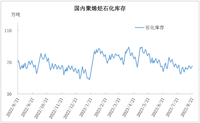 分析:周一石化库存65万吨,较上周末增加3万吨,较去年同期低7万吨。进入8月份之后,石化去库明显受阻,甚至一度出现垒库迹象,且连续两周去库不足5万吨,远低于正常水平。近期石化企业开工率整体提高,且新装置再次投产,供应压力增加,需求改善有限,尤其是塑编等出现负反馈,导致去库速度明显放缓。