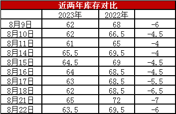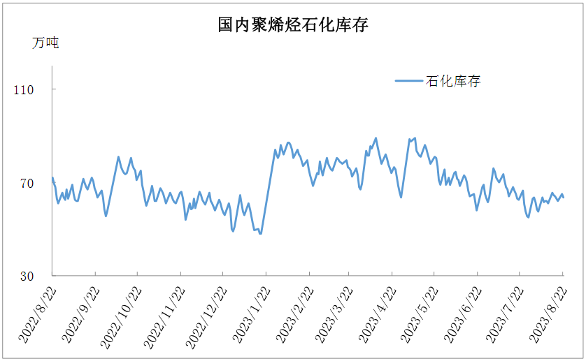 分析:周二石化库存63.5万吨,较昨天下降1.5万吨,较去年同期低6万吨。进入8月份之后,石化去库明显受阻,甚至一度出现垒库迹象,且连续两周去库不足5万吨,远低于正常水平。近期石化企业开工率整体提高,且新装置再次投产,供应压力增加,需求改善有限,尤其是塑编等出现负反馈,导致去库速度明显放缓。
