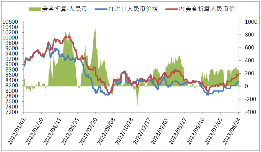 本周PE进口线性美金主流价格偏强整理,周末维持970-980,折算人民币成本在8600-8700,市场主流8250-8300,高国产线性350-400左右,价差略扩大