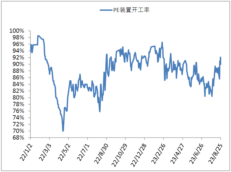 本周PE装置多恢复正常生产,而周末临时停车装置增加,开工负荷周末在90%左右,比上周+3%,较去年同期+8%。PE暂无计划停车装置,兰州石化LDPE、大庆石化HDPE计划开车,预计PE开工负荷小幅上涨。