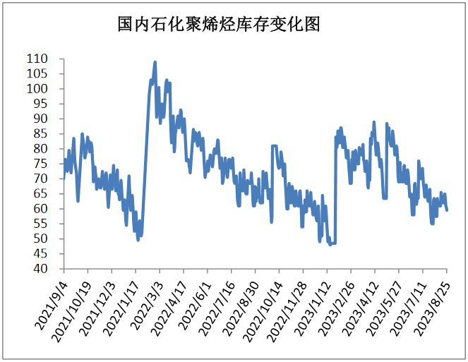 截至8月25日石化聚烯烃库存在59.5万吨,较上周下降2.5万吨。石化库存下跌,主因临近月底,贸易商积极执行计划,库存向下传导;其次因为下游产能利用率继续提升,刚需成交尚可。下周月底月初,供应陆续增加,月底石化陆续停销结算,库存预期小幅增加。