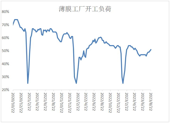 本周PE包装膜开工负荷小幅上涨1%在51%左右,原料库存天数下降,订单天数延长,多抵触原料涨价,采购放缓。后市看,随着金九银十以及假期到,物流、日化包装膜企业订单或有所跟进,但是下周月底月初,询单和开工负荷预计均变化不大,对聚乙烯市场支撑尚可。