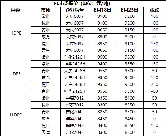 PE出厂价统计PE市场价统计本周聚乙烯市场价格冲高回落,较上周多上涨50-250元/吨。伊朗事件继续发酵,LDPE带动LLDPE上涨;资金继续拉涨,周末推涨气氛减弱,盘面小幅回调,市场价格推涨过快,也开始阶段性回调,叠加国际原油期货走势偏弱,三者形成共振,市场价格小幅下滑,炒作结束后,LDPE价格下滑较快。华北市场LLDPE主流8260-8300,LDPE主流9500-9550,HDPE主流8150-9350;华东市场LLDPE主流8350-8400,LDPE主流9400-9600,HDPE主流8150-9750;华南市场LLDPE主流8450-8700,LDPE主流9300-9600,HDPE主流8500-10050。