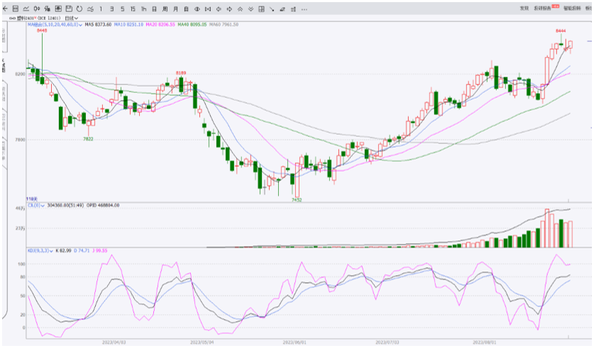 3、减产氛围带来的利好支撑也一直存在,美国夏季燃油消费高峰尚未结束,美联储9月不加息的概率还是偏高,国际原油期货预计高位整理;国内宏观面维持偏暖,经济数据较差,利好政策有继续释放预期。