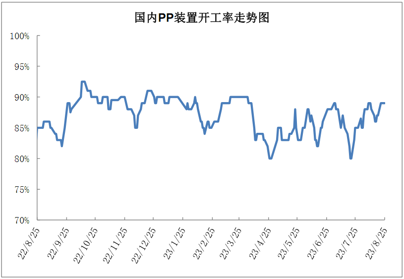 本周PP检修力度有所减弱,开工率小幅反弹,目前PP开工率在89%附近,较上周增加2%,较上月同期高5%,较去年同高6%。近期检修力度有所减,开工率反弹在高位,供应整体增加明显。新装备方面,京博石化、潍坊舒服康等陆续投产,近期宁夏宝丰也面临投产,后去宁波金发等也有投产计划,后期供应压力较大。