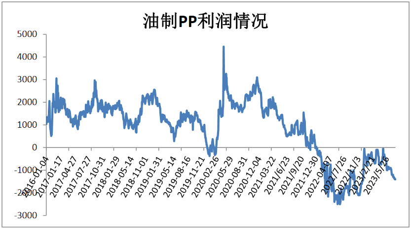 本周油价跌势放缓,但是并未破位下行。对于全球经济疲软的担忧,油价整体回落,目前布伦特跌破85美元大关,WTI跌破80美元大关,对应油制PP一体化成本降至8750元/吨附近,亏损略有收窄,目前在1100-1200元/吨。PP在亏损背景下成本端仍有一定支撑,但是近期丙烯等也出现明显松动,成本支撑力度减弱。