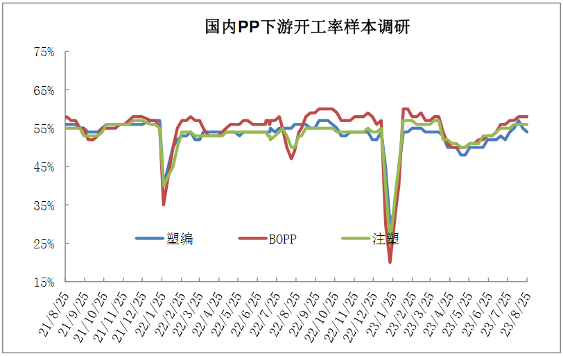 PP需求淡季已经进入尾声,但是缺乏实质性改善。虽然目前需求较前期有改善,但是旺季特征不明显,浙江部分地区塑编企业8月联合减产30%仍在执行,显示出现有整体偏弱。此外前期PP上涨一度刺激投机性需求增加,近期价格高位成交困难,投机性需求明显减弱。