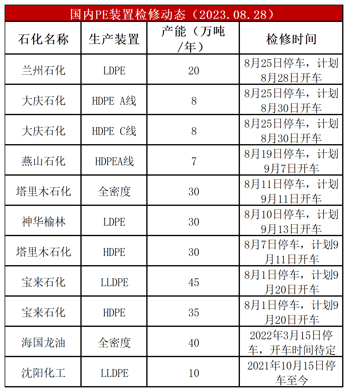 简评:PE装置兰州石化LDPE、大庆石化HDPE停车,开工负荷下降 90%左右,比上周+3%,较去年同期+8%。PE暂无计划停车装置,兰州石化LDPE、大庆石化HDPE计划开车,预计PE开工负荷小幅上涨。