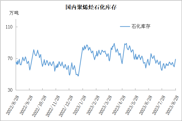 分析:周一石化库存69万吨,较上周末增加9.5万吨,较去年同期高3.5万吨。进入8月份以来,石化去库明显受阻,甚至出现累库迹象,本周末石化累库近10万吨,明显高于正常水平,且目前库存首次超过去年同期,低库存优势荡然无存。目前聚烯烃检修减少,新装置陆续投产,供应增加明显,需求改善有限,供需矛盾逐渐显现,去库难度加大。