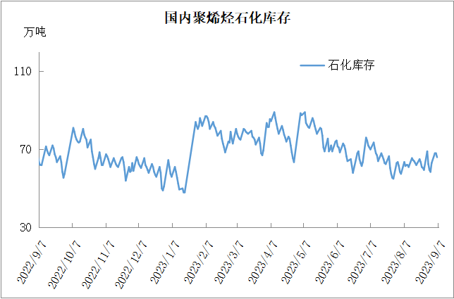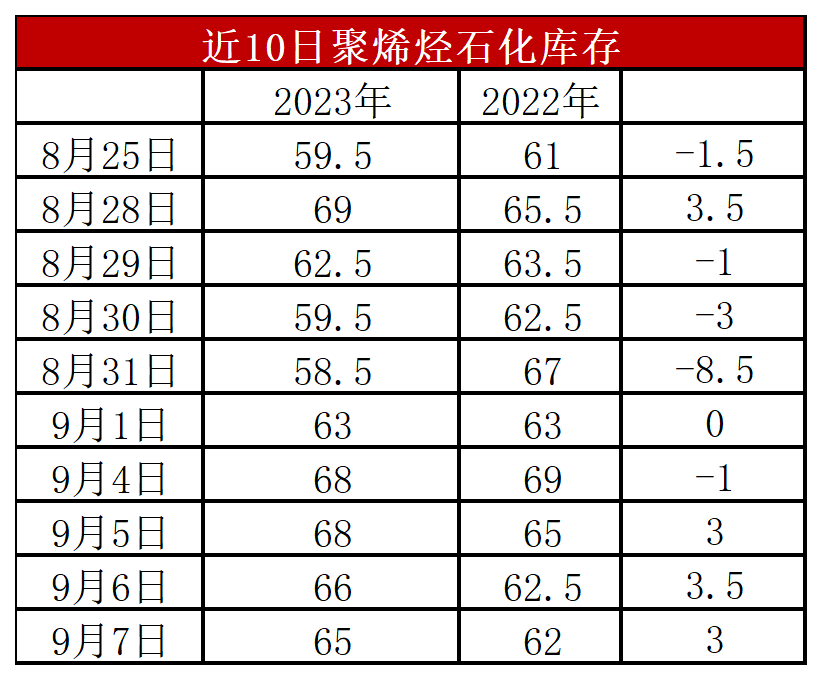 分析:周四石化库存65万吨,较昨天下降1万吨,较去年同期高3万吨。8月份开始随着供应增加,石化去库明显受阻。目前聚烯烃检修力度减弱,且新装置面临投产(虽然部分PDH因亏损推迟,但是其他新装置陆续投产),需求改善有限,且社会库存偏高,石化去库难度加大,逐渐高于去年同期水平。