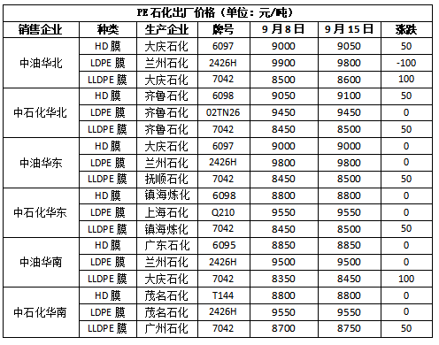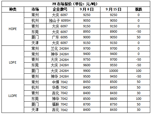 华北市场LLDPE主流8380-8430,LDPE主流9450-9650,HDPE主流8250-9250;华东市场LLDPE主流8380-8480,LDPE主流9230-9850,HDPE主流8200-9500;华南市场LLDPE主流8600-8800,LDPE主流9500-9600,HDPE主流8600-9850。