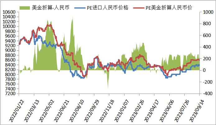 本周PE进口线性美金主流价格大稳小动,周末在970-990,折算人民币成本在8600-8750,市场主流8400左右,高国产线性200-350左右,价差缩小。