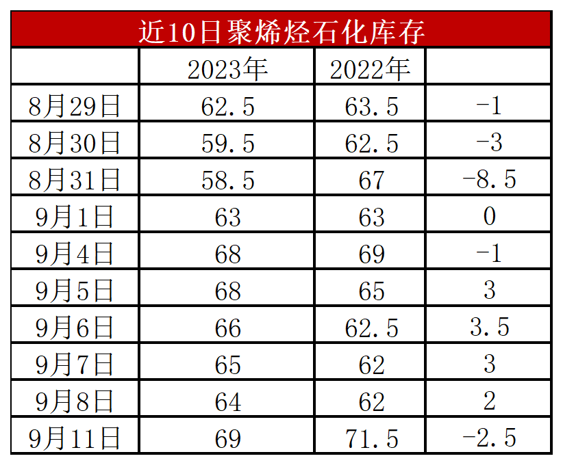 分析:周一石化库存69万吨,较上周末增加5万吨,较去年同期低2.5万吨。8月份以来石化去库明显放缓,甚至出现高于去年同期的情况。目前来看供应端压力不减,需求改善有限,且社会库存整体偏高,石化去库难度加大,预计近期维持缓慢去库状态。