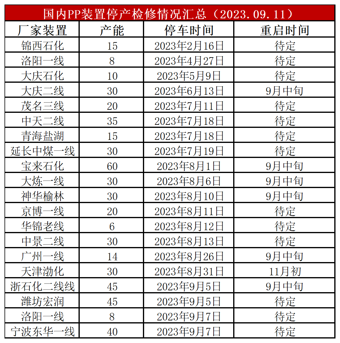简评:上周浙江石化、潍坊弘润等装置停车检修,PP开工率小幅下跌,目前在85%附近,较上周下降2%。虽然PP开工率下降但是幅度有限,且后期检修力度不大,PP开工率下降空间有限。新装置方面,继京博石化、安庆石化之后,茂名东华、宁夏宝丰等新装置也面临投产,后期供应压力整体较大。